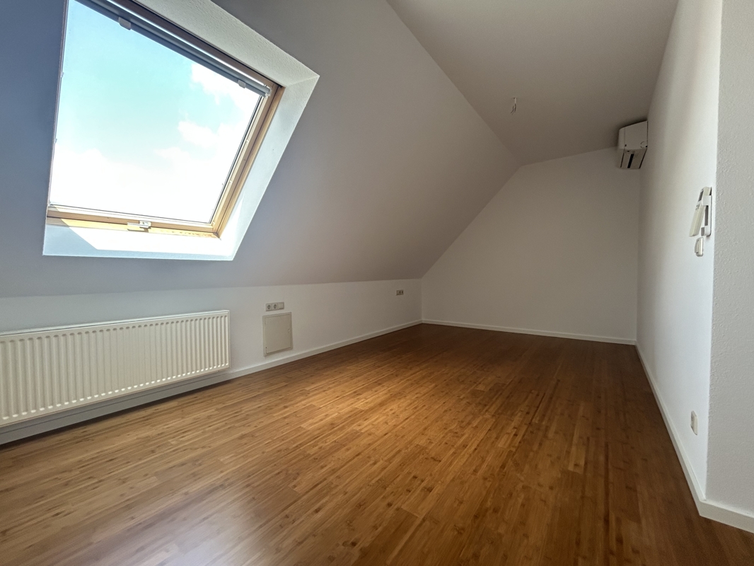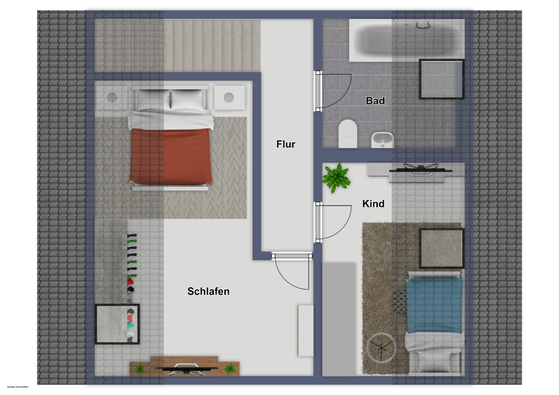 Über eine stilvolle Innentreppe gelangen Sie ins Obergeschoss, das mit einem hellen Schlafzimmer, einem weiteren Zimmer (z. B. als Kinder-, Arbeits- oder Gästezimmer) und einem modernen Tageslichtbad mir Badewanne und Dusche überzeugt.